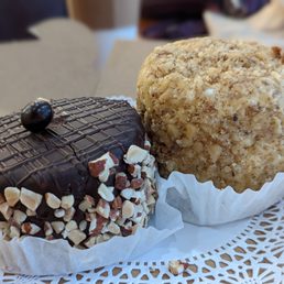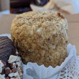 The sweet tooth strikes again! I was walking around Main St. and wanted dessert to balance a very savory and salty dinner. I was able to find a few local ice cream shops, but they weren't quite enticing to me. I happened to stumble on Perfectly Sweet, which caught my attention because of its display cases of mini pies, giant truffles and sugar cookies, and personal-sized mousse cakes, cheesecakes, tarts, etc. What I also liked about the bakery was the homemade charm that the desserts had. It was rather difficult for me to settle on something, but I wasn't nearly as hungry to warrant one of the cakes. I ended up purchasing two types of chocolates: a white chocolate raspberry truffle and a white chocolate hazelnut crunch cup. They were bite sizes compared to the other desserts, but that's all I was really looking for anyway. but I thoroughly enjoyed the chocolates. The white chocolate raspberry truffle was huge, unlike an artisan truffle you may find at a chocolatier. It was a few notches down from the size of a chocolate covered strawberry. The white chocolate was rich and sweet, and there were actually real raspberries inside. The other piece was loaded with chopped hazelnuts, so it had a great crunchy texture. This, too, was a bit on the sweeter side.